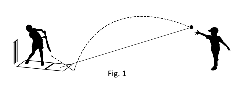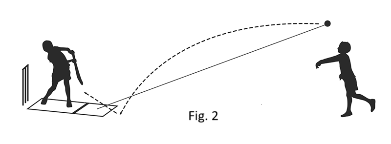 3. Pitch the ball to the batsman using a slight upwards flick of the hand, to make the ball land just in front of the batsman. Variations on how the ball is flicked, either slightly higher or lower, or slightly off to the right or left, can mix up the position where the ball lands allowing the batsman to practise different shots (Fig. 1). An overarm flick can be used for more experienced batsmen (Fig. 2).